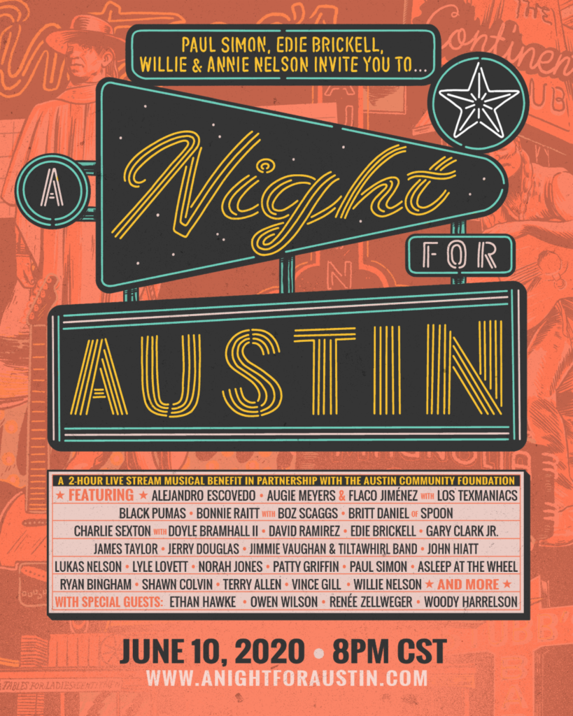 Performances from Simon, Nelson, James Taylor, and more will intertwine with appearances from the likes of Ethan Hawke, Renée Zellweger, Woody Harrelson, and Owen Wilson; all Texans with a strong love for the city and its people. 100% of the money raised will go to a fund managed by the Austin Community Foundation to be distributed directly to MusiCares Austin, HAMM, Central Texas Food Bank, Six Square, Southern Smoke Foundation, Red River Cultural District, and People Fund. Locals will be able to watch “A Night For Austin†on CBS Austin (KEYE). Worldwide, “A Night For Austin†will be streamed on anightforaustin.com and at Luck Reunion’s Twitch channel, complete with a “virtual tip jarâ€â€”a direct link to donate throughout the evening. A full, ever-growing list of performers can be found below.